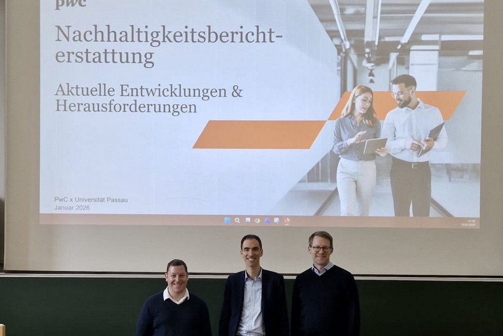 Am 15.01.2026 begrüßte Prof. Dr. Pelger im Rahmen der Vorlesung „Bilanzen“ Hans Hartmann (Partner, Capital Markets & Accounting Advisory Services) und Bernhard Schatz (Director, Capital Markets & Accounting Advisory Services) von der Wirtschaftsprüfungsgesellschaft PwC aus Wien zu einem Gastvortrag. Die beiden Referenten gaben den Studierenden praxisnahe Einblicke in die aktuellen Entwicklungen der Nachhaltigkeitsberichterstattung in der EU. Anschließend nutzten die Studierenden die Gelegenheit, Fragen zu den Herausforderungen in der Wirtschaftsprüfung zu stellen.