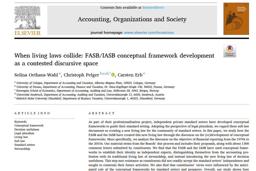 Professor Pelger hat den Artikel mit dem Titel “When living laws collide: FASB/IASB conceptual framework development as a contested discursive space” in der Zeitschrift Accounting, Organizations and Society publiziert, die international zu den angesehensten Fachzeitschriften im Bereich Accounting zählt (VHB Rating Rechnungswesen: A+, FT50). Der Artikel ist in Ko-Autorenschaft mit Selina Orthaus-Wahl (Universität zu Köln) und Carsten Erb (HHU Düsseldorf) entstanden. Das Paper ist als Open Access Publikation hier frei zugänglich.