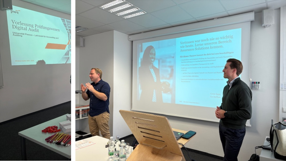 During the 2025/26 winter semester, the Corporate Governance and Auditing course was regularly supplemented by practice-oriented lectures from PwC. Under the direction of Kerstin Krauß (WP, StB and partner) and Patrick Konhäuser (WP, StB and director) of the PwC Assurance Solutions platform, PwC employees gave students an insight into the profession of auditor and the process of an annual audit.