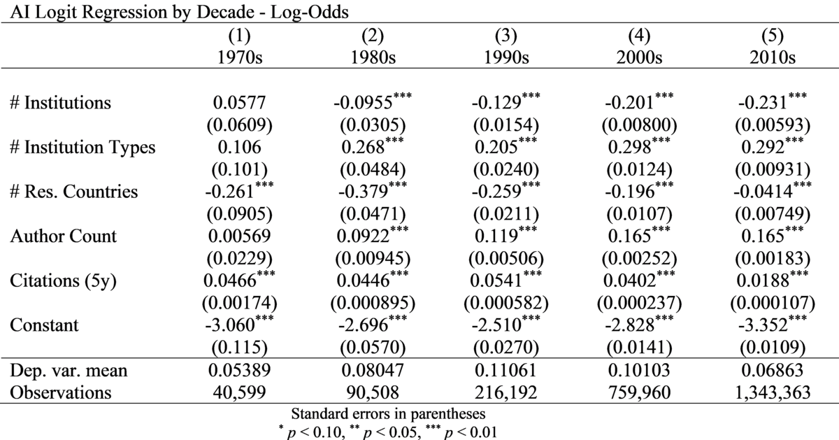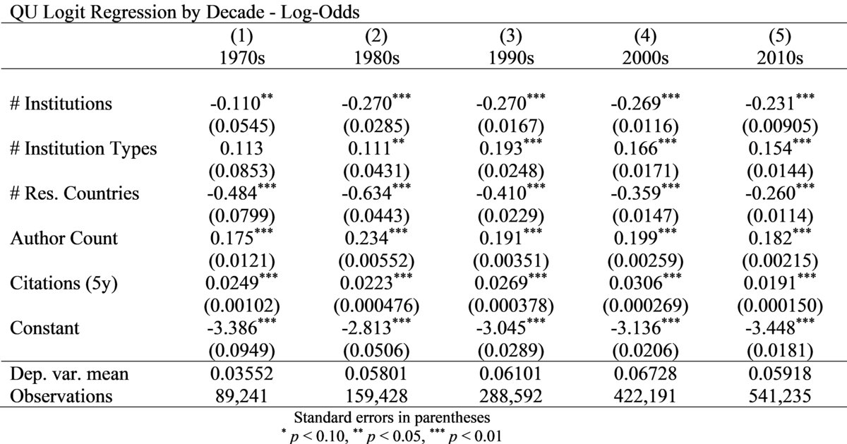 Lesebeispiel: Die Vielfalt der Institutionstypen weist durchweg eine positive Korrelation mit den Log-Odds einer Patentzitierung auf, deren Stärke jedoch über die Jahre variiert. So lagen die Log-Odds in den 1970er Jahren bei 0,113 und in den 2010er Jahren bei 0,154.