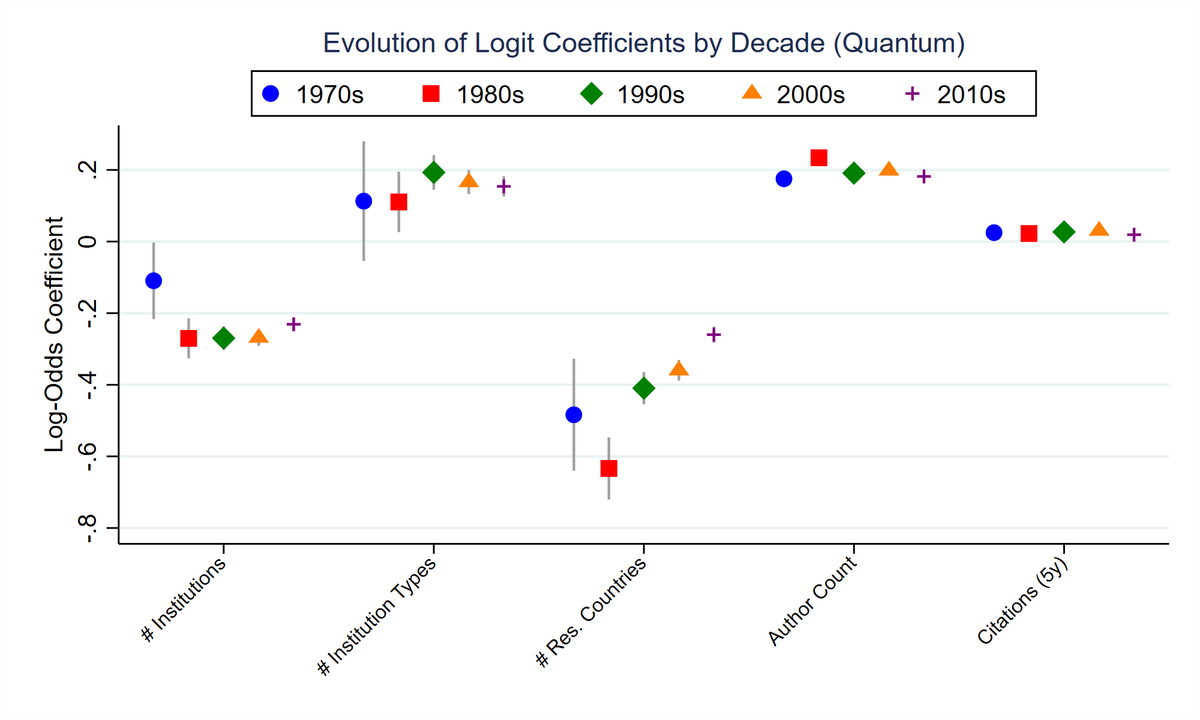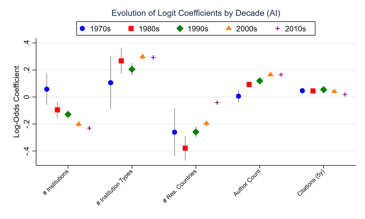 Die Anzahl der beteiligten Institutionen steht durchgehend in einem negativen Zusammenhang mit den Log-Odds einer Patentzitierung, während die institutionelle Diversität in allen Dekaden positiv assoziiert ist. Im Gegensatz dazu zeigt sich der Effekt internationaler Zusammenarbeit (Anzahl der beteiligten Länder) in den früheren Jahrzehnten stark negativ und nimmt im Zeitverlauf an Bedeutung ab.