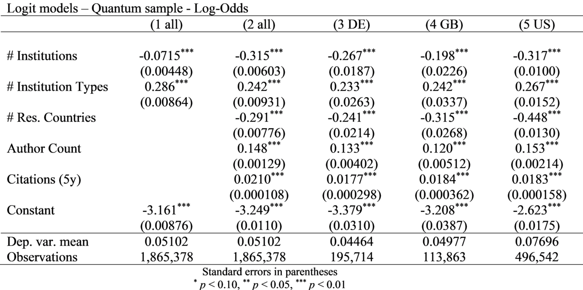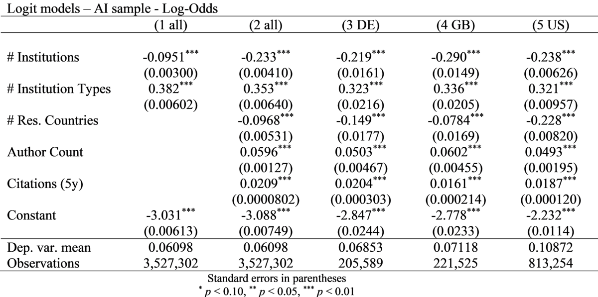 Lesebeispiel: Die Anzahl der Institutionen und die Anzahl der teilnehmenden Länder korreliert negativ mit den Log-Odds einer Patentzitation, während die Vielfalt der Institutionstypen, die Zahl der Autoren und Zitate innerhalb von fünf Jahren positiv korrelieren. Die Effektrichtung ist in Deutschland, Frankreich und den USA identisch, das Ausmaß variiert jedoch zwischen den Ländern.
