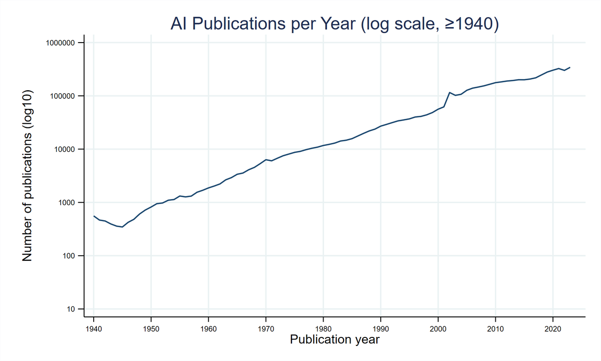Die Abbildung zeigt die jährliche Anzahl wissenschaftlicher Publikationen im KI-Bereich. Insgesamt ist ein kontinuierlicher Anstieg zu beobachten, wobei das Publikationsvolumen insbesondere seit den 1990er Jahren deutlich zugenommen hat.