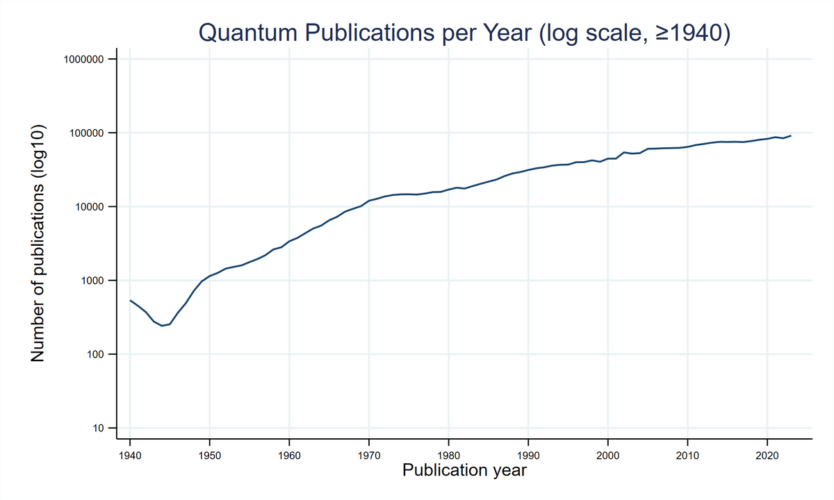 Die Abbildung zeigt die jährliche Anzahl wissenschaftlicher Publikationen im Quantenbereich. Abgesehen von einem Rückgang in den 1940er Jahren ist ab 1950 ein kontinuierlicher Anstieg zu beobachten.