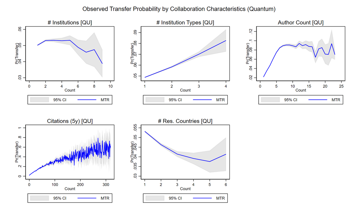 Die beobachtete Transferwahrscheinlichkeit ist am höchsten bei zwei bis drei beteiligten Institutionen und nimmt danach ab. Eine höhere institutionelle Diversität geht mit einem stetigen Anstieg der Transferwahrscheinlichkeit einher. Bei der Anzahl der Autoren steigt die Wirkung zunächst rasch bis etwa zehn Autoren an und flacht dann ab. Der Einfluss von Zitationen nimmt bis etwa 300 Zitationen zu und stabilisiert sich anschließend. Mit zunehmender Anzahl beteiligter Länder sinkt die Transferwahrscheinlichkeit, wobei die Unsicherheit bei höheren Werten zunimmt.