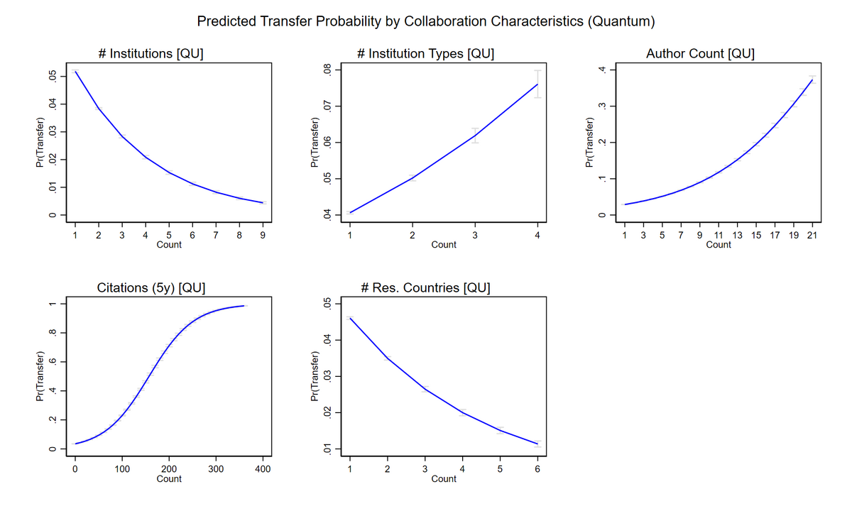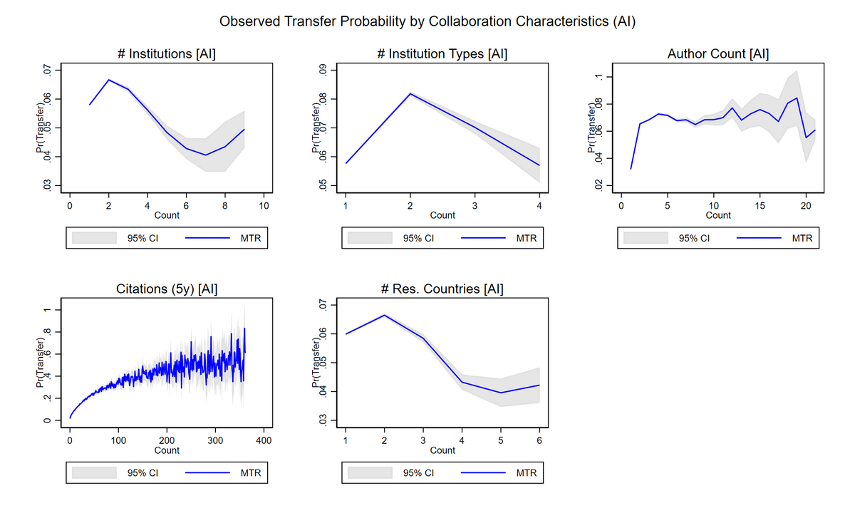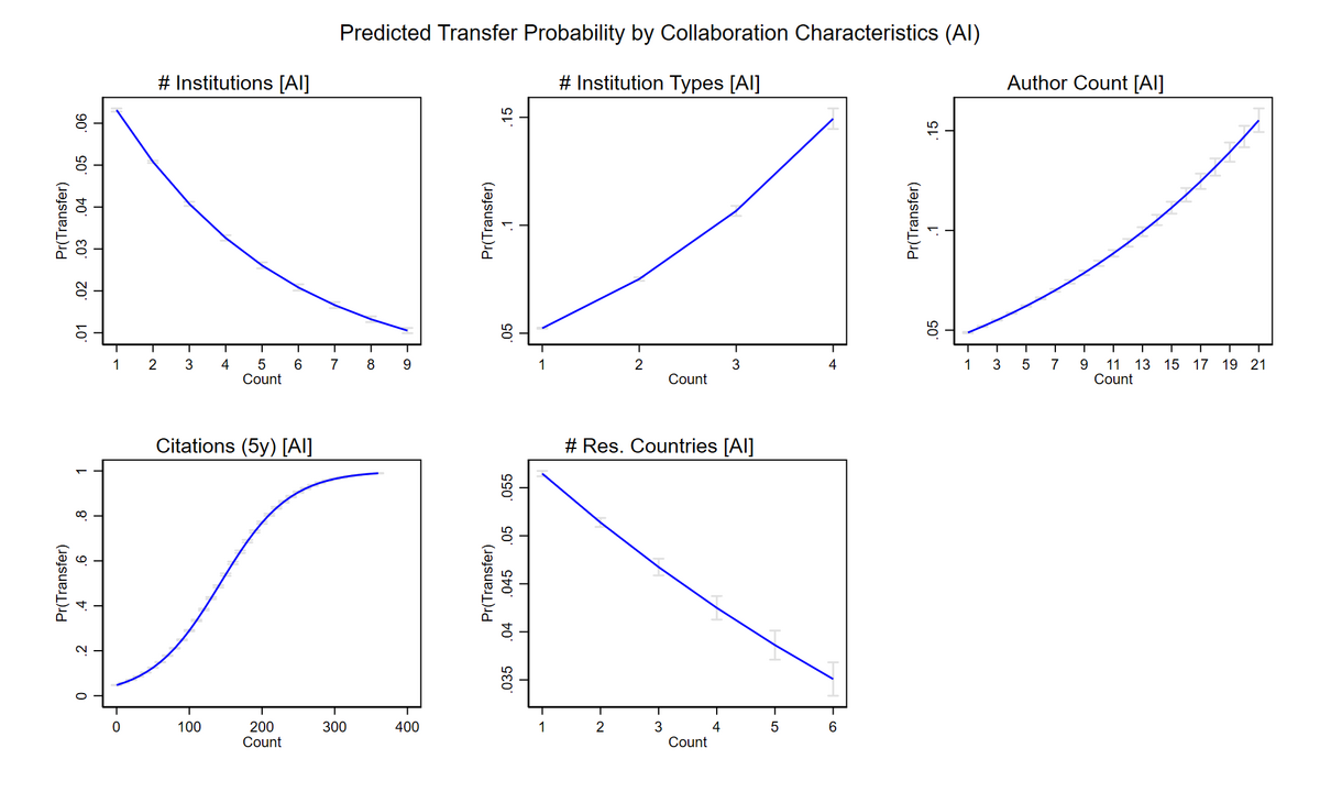 Die vorhergesagte Transferwahrscheinlichkeit nimmt mit der Anzahl beteiligter Institutionen und Länder ab, steigt jedoch bei größerer institutioneller Diversität und einer höheren Anzahl an Autoren. Im Hinblick auf Zitationen steigt die Wahrscheinlichkeit zunächst stark an und erreicht bei etwa 300 Zitationen ein Plateau.